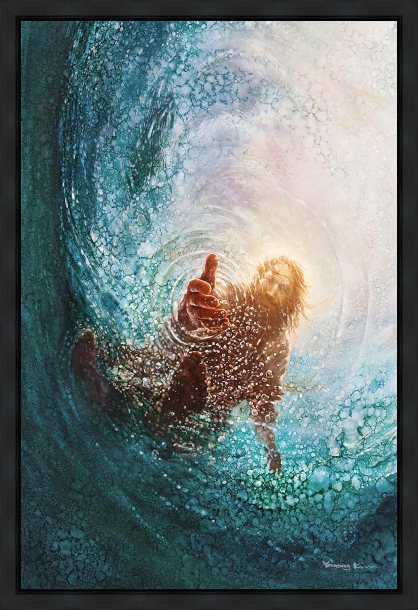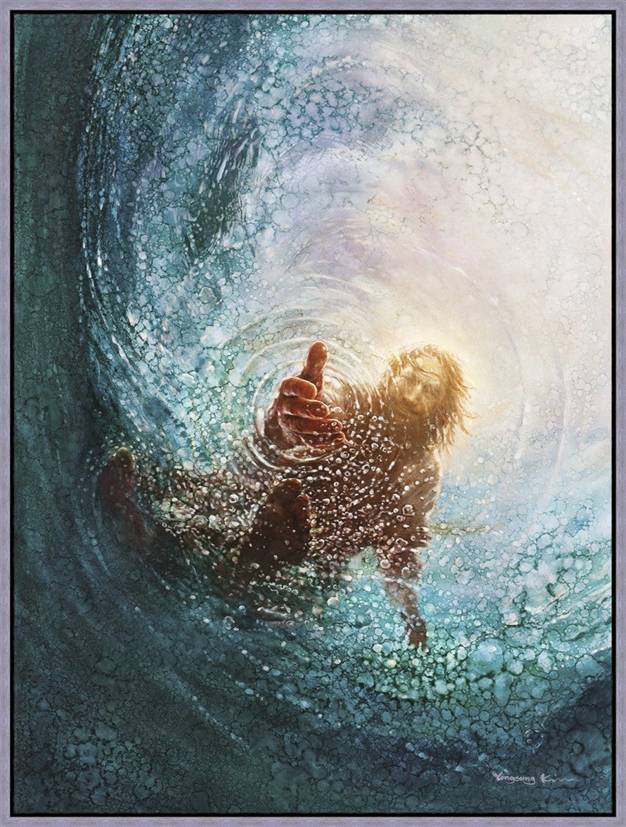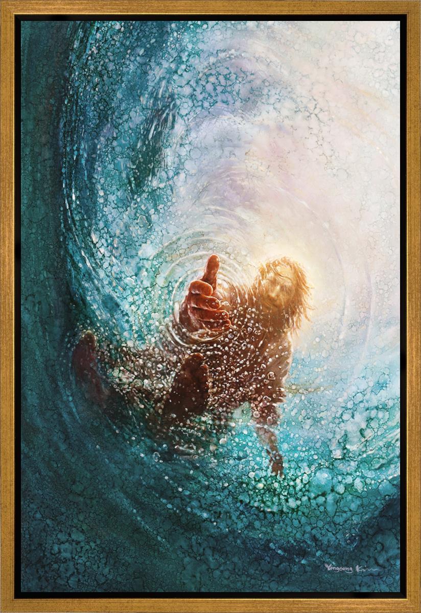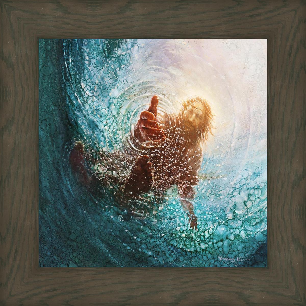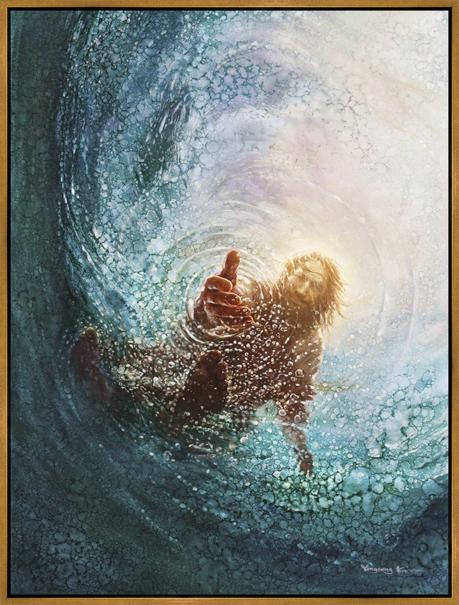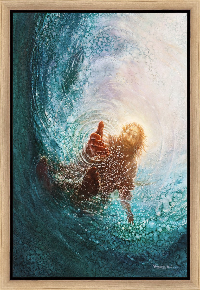 It's incredible that Peter walked on water for a short time, but even more miraculously was Jesus saving Peter. The Hand of God was painted from the perspective of Peter. Painting The Hand of God in this way, it is very easy for each of us to see ourselves as Peter: seeing ourselves ""drowning"" metaphorically and needing the Jesus Christ to save us. Jesus walking on water to save Peter is one of the most searched online Bible stories of all time and one that people the world over connect with on a deep level. Most paintings that portray this story do so from a third party perspective. Instead, Yongsung Kim chose to portray this story from the first person perspective of Peter.