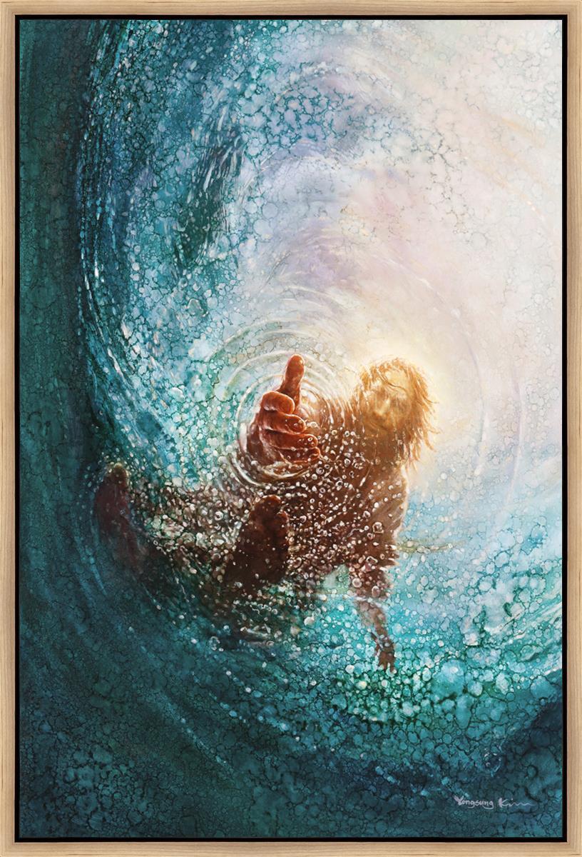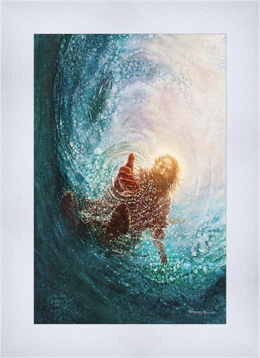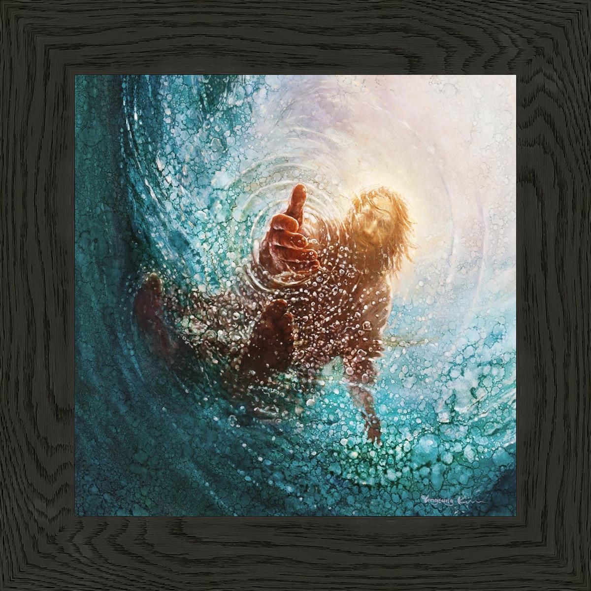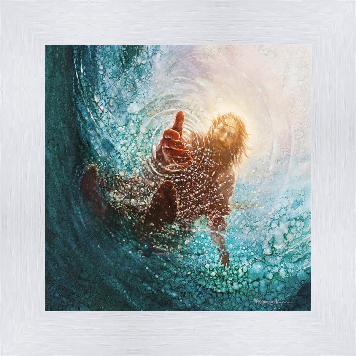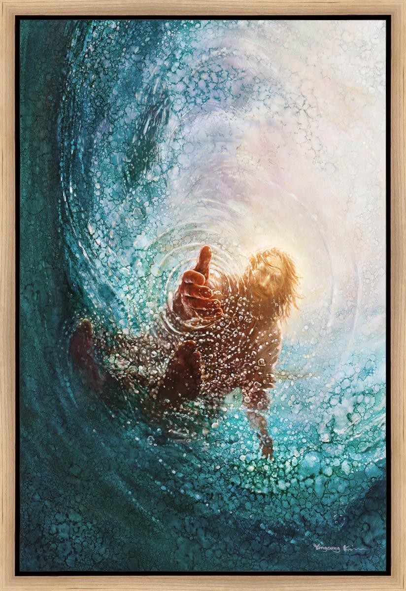 It's incredible that Peter walked on water for a short time, but even more miraculously was Jesus saving Peter. The Hand of God was painted from the perspective of Peter. Painting The Hand of God in this way, it is very easy for each of us to see ourselves as Peter: seeing ourselves ""drowning"" metaphorically and needing the Jesus Christ to save us. Jesus walking on water to save Peter is one of the most searched online Bible stories of all time and one that people the world over connect with on a deep level. Most paintings that portray this story do so from a third party perspective. Instead, Yongsung Kim chose to portray this story from the first person perspective of Peter.