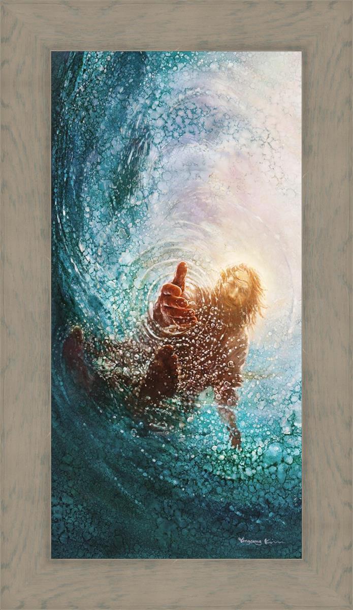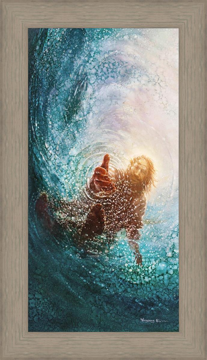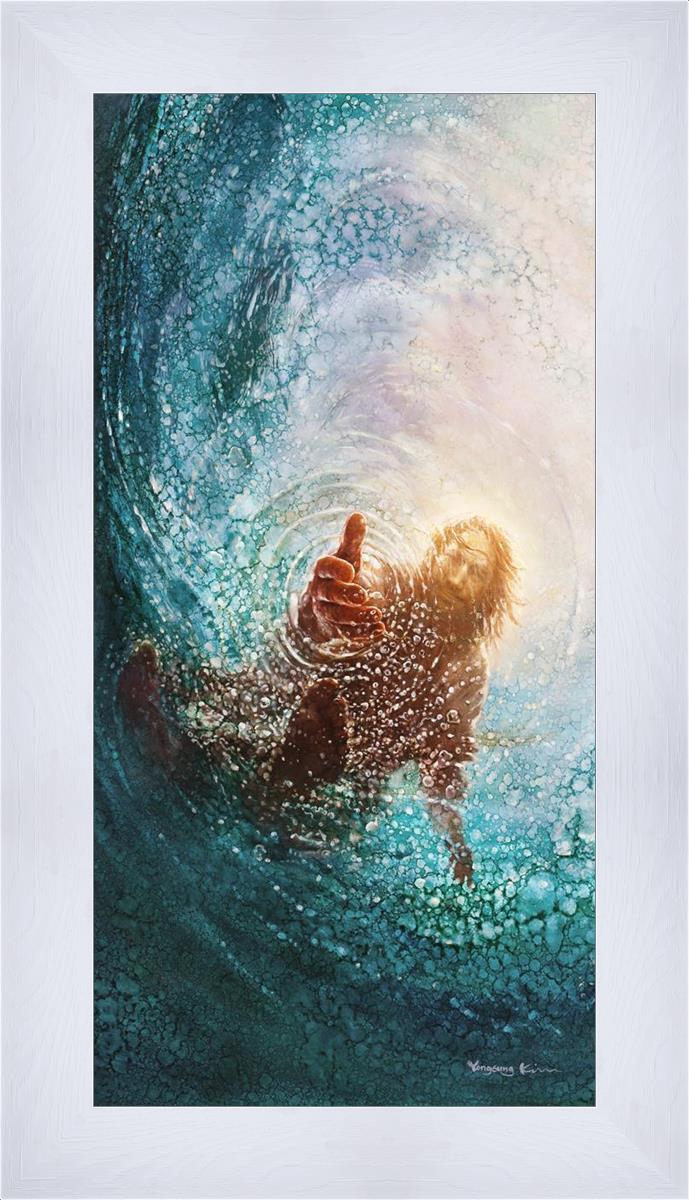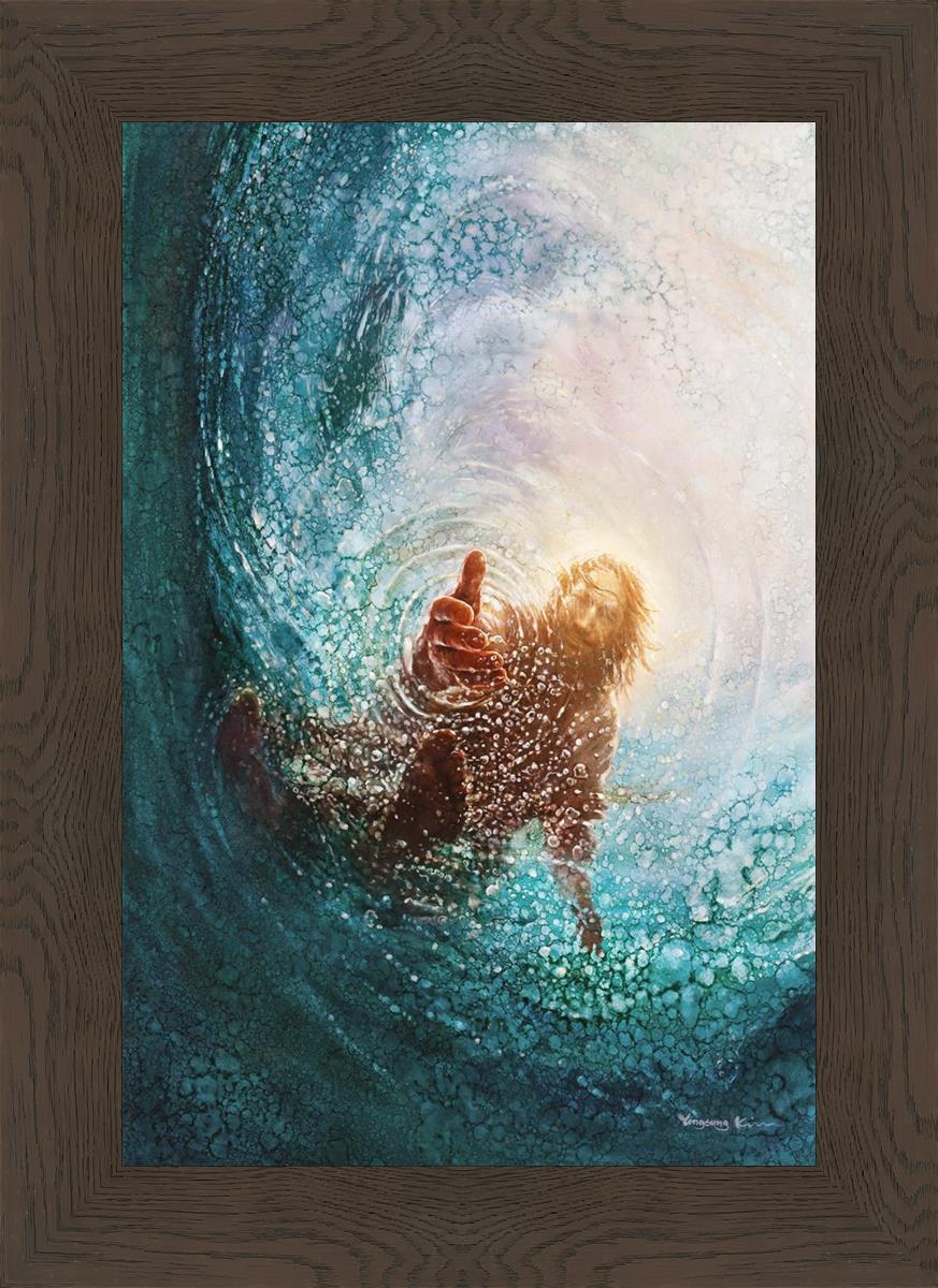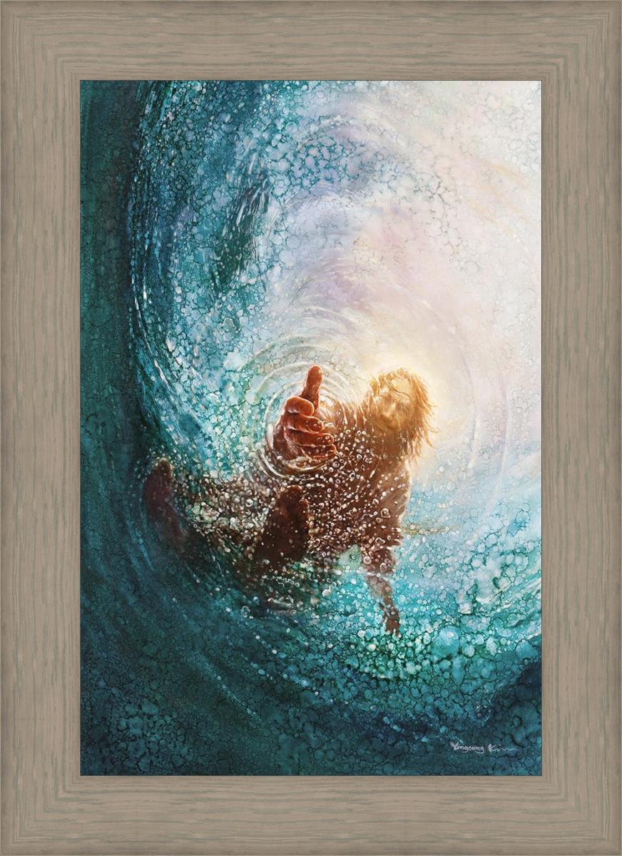 Continue Shopping"This painting is by Yongsung Kim, it is called The Hand of God. This painting portrays the experience of Jesus walking on water, and then saving Peter from drowning.