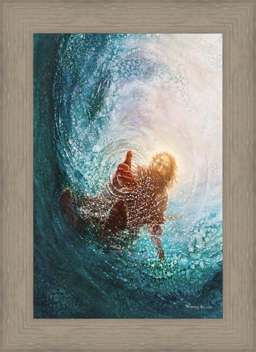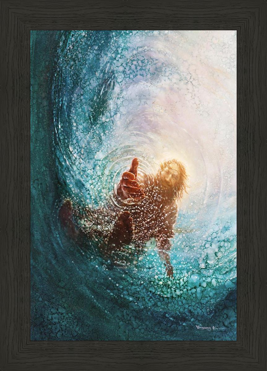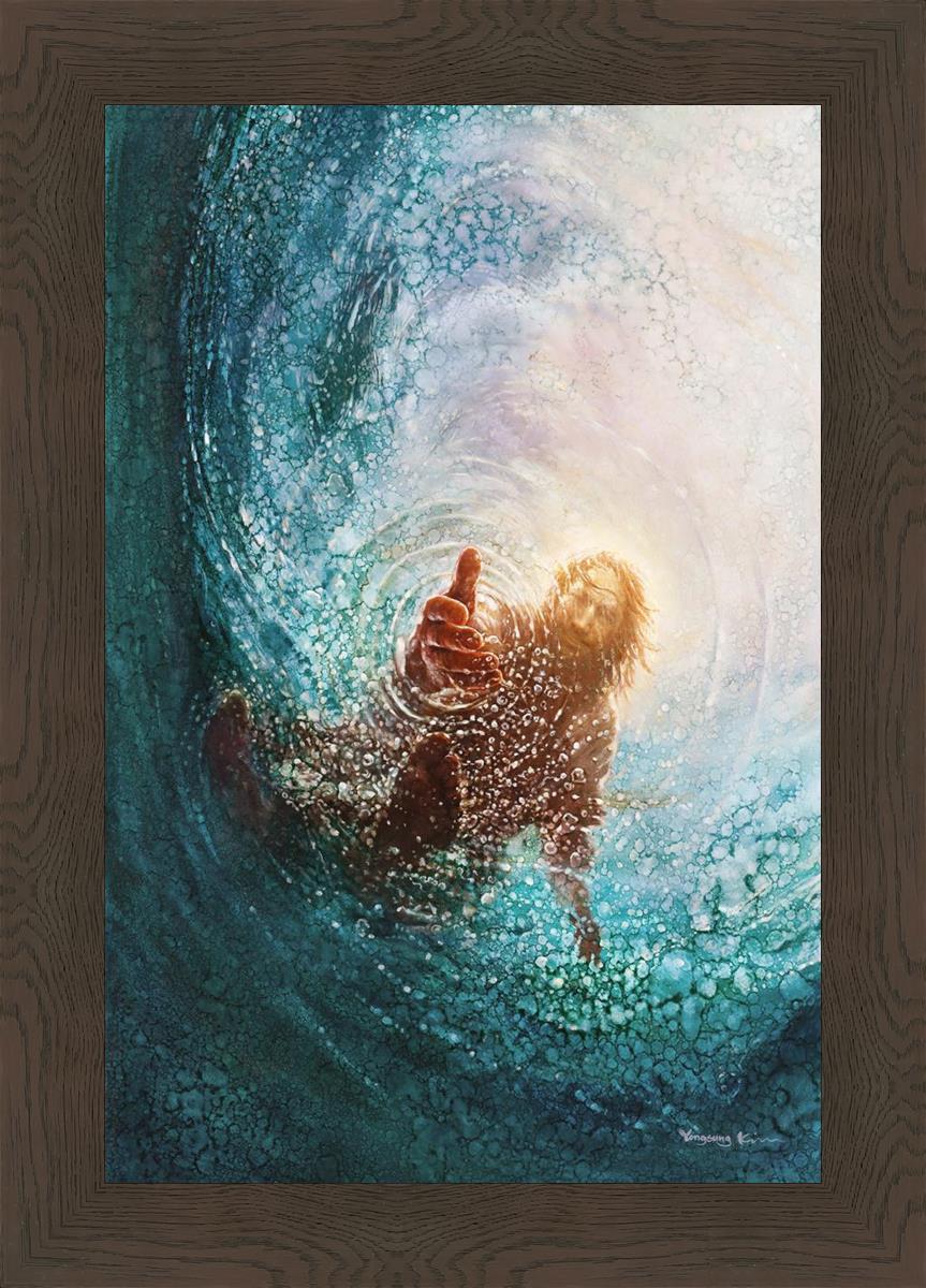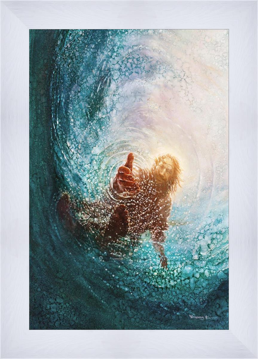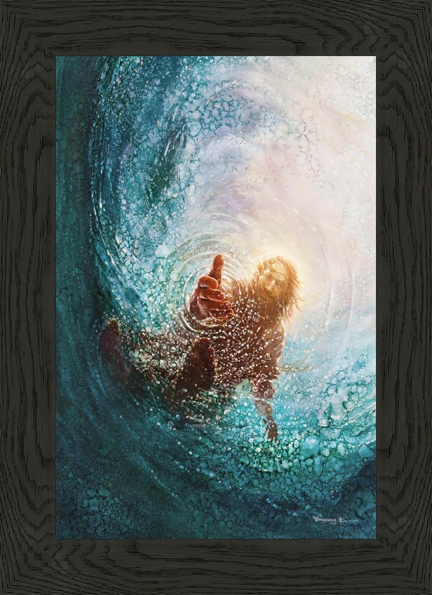 Continue Shopping"This painting is by Yongsung Kim, it is called The Hand of God. This painting portrays the experience of Jesus walking on water, and then saving Peter from drowning.