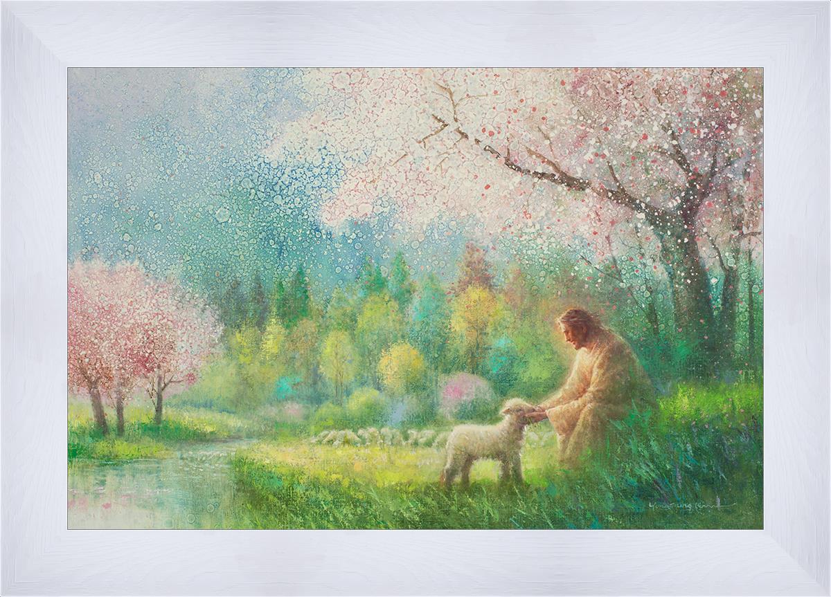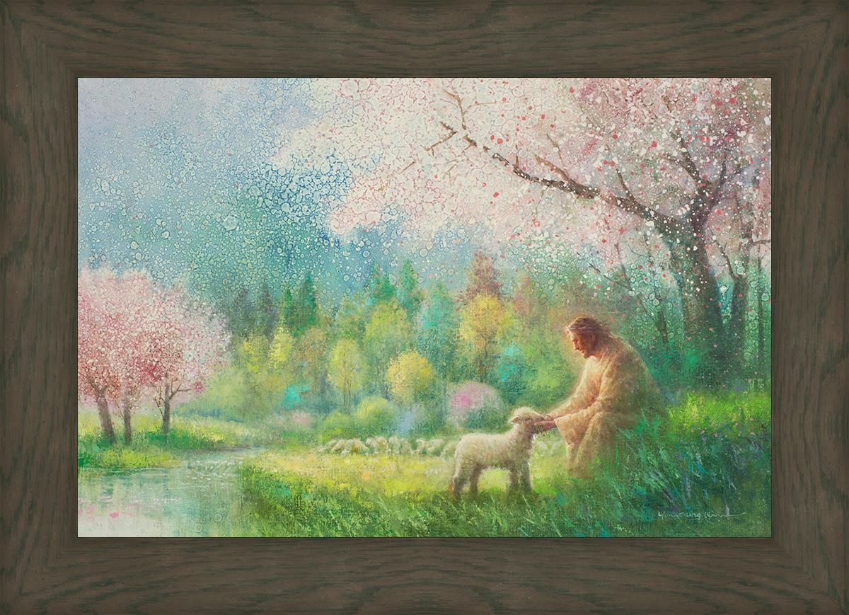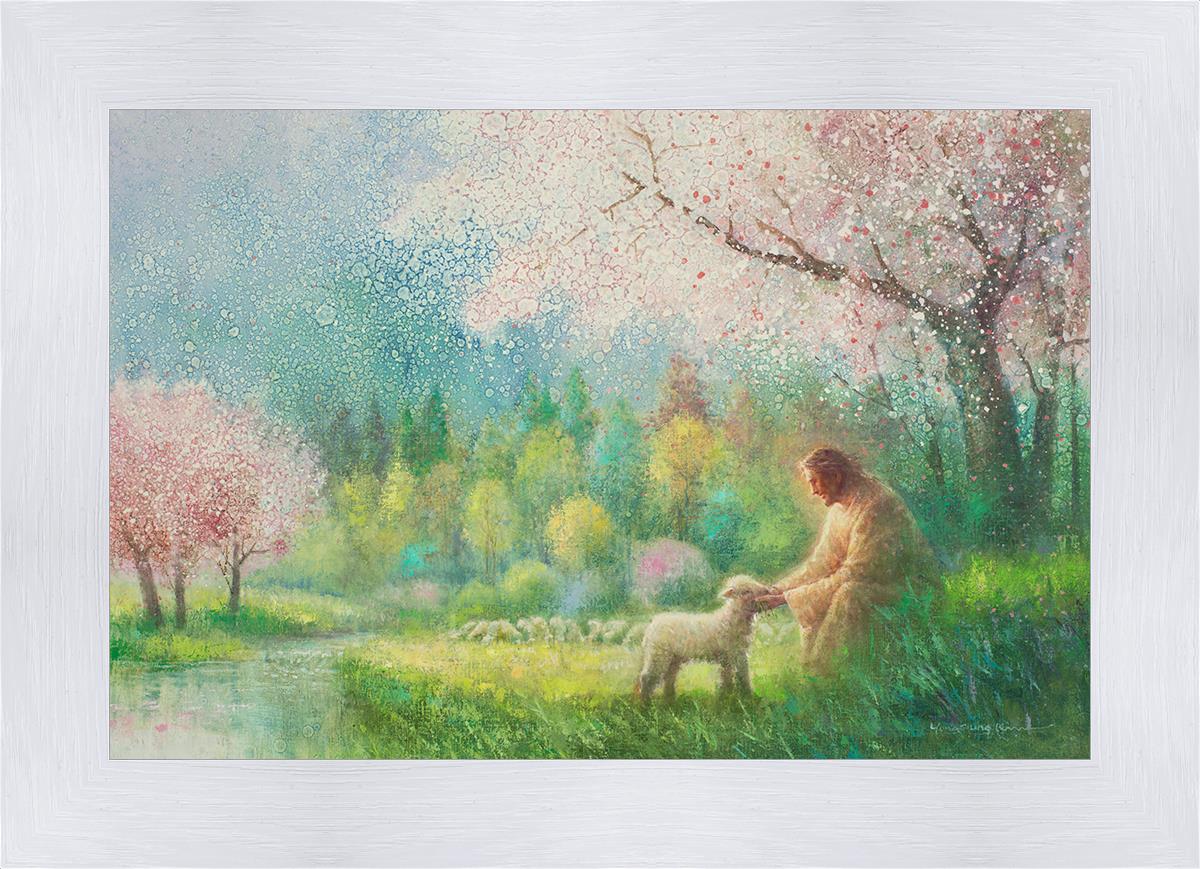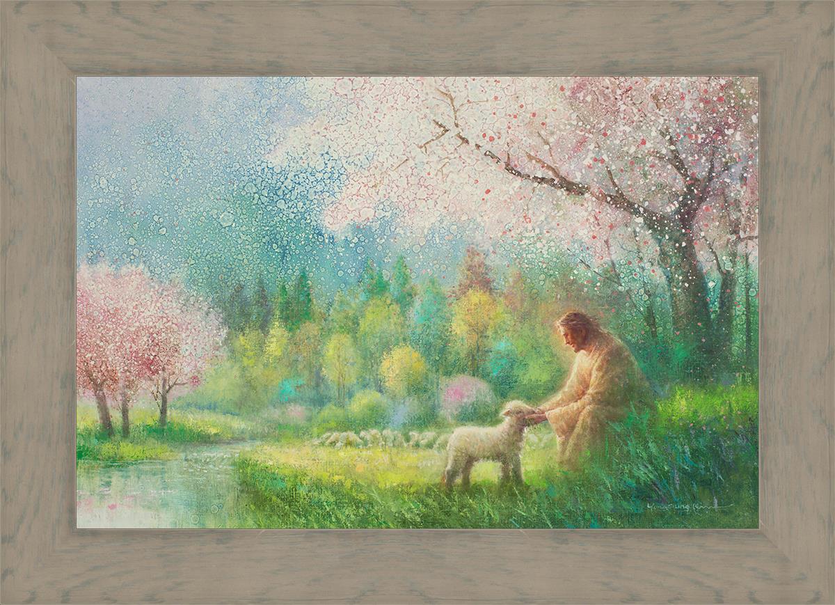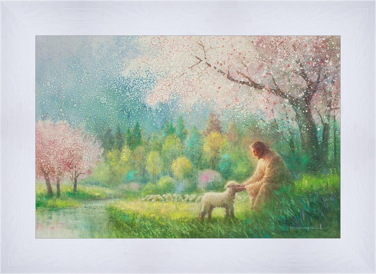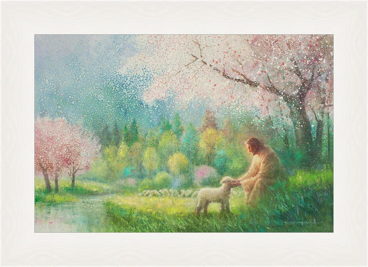 Continue Shopping"I Know Thy Name" by Yongsung Kim portrays Jesus Christ comforting a young lamb in a vibrant spring landscape, symbolizing His caring and personal knowledge of each individual.