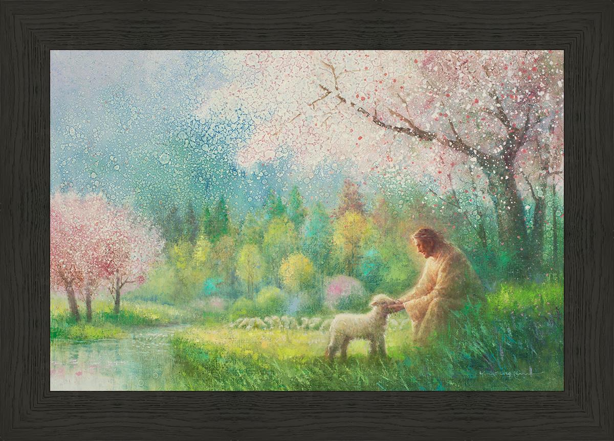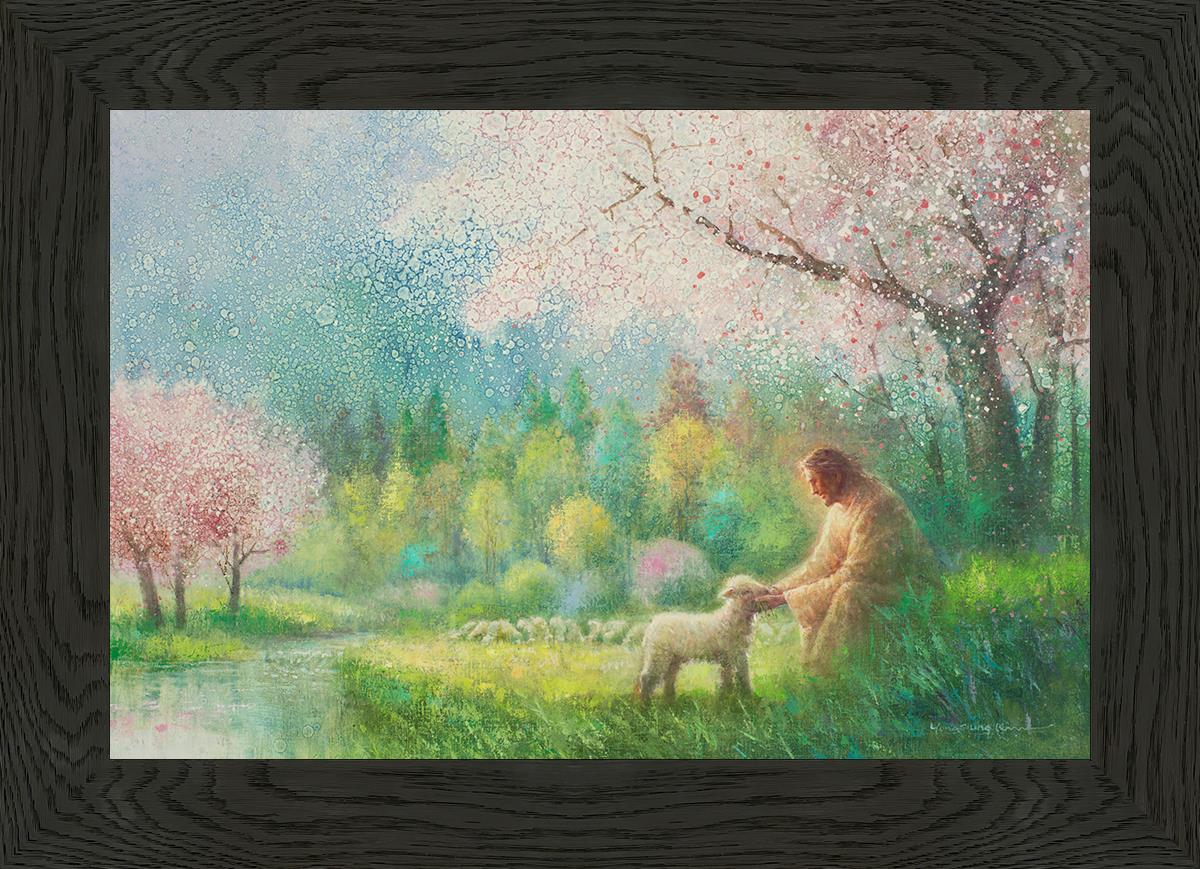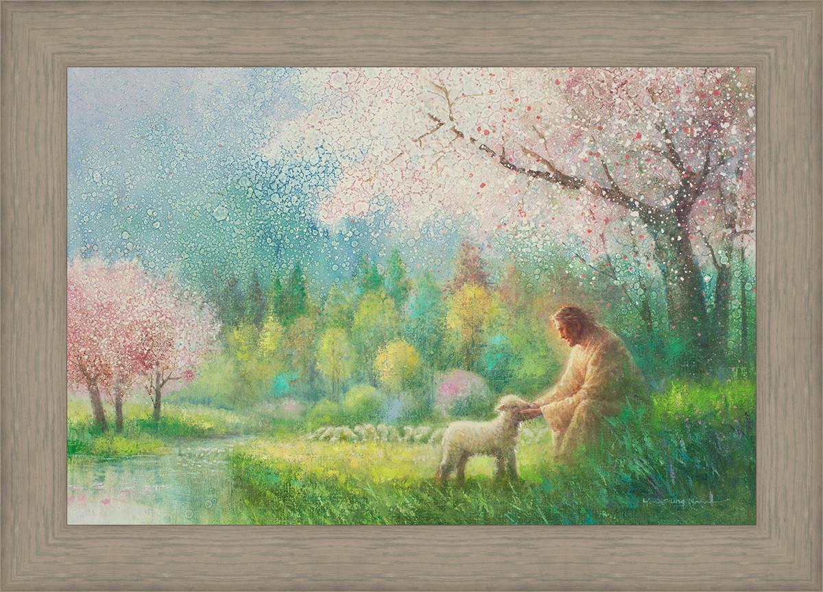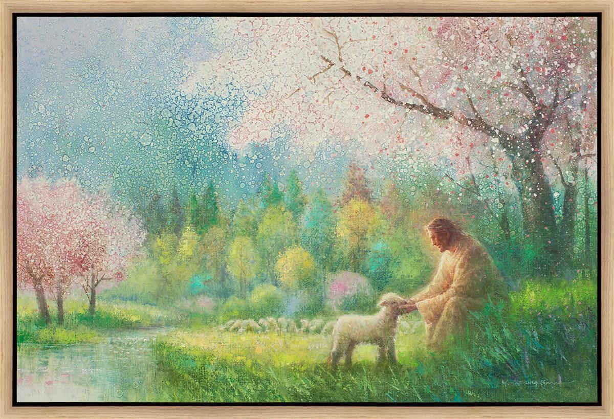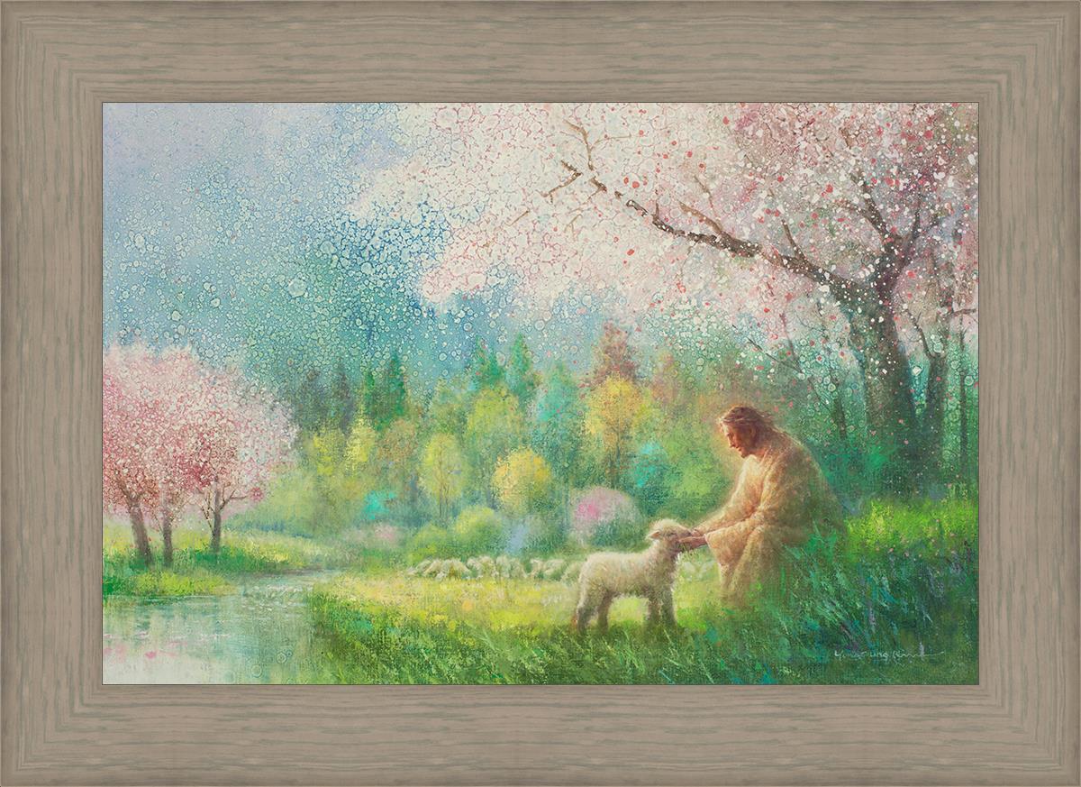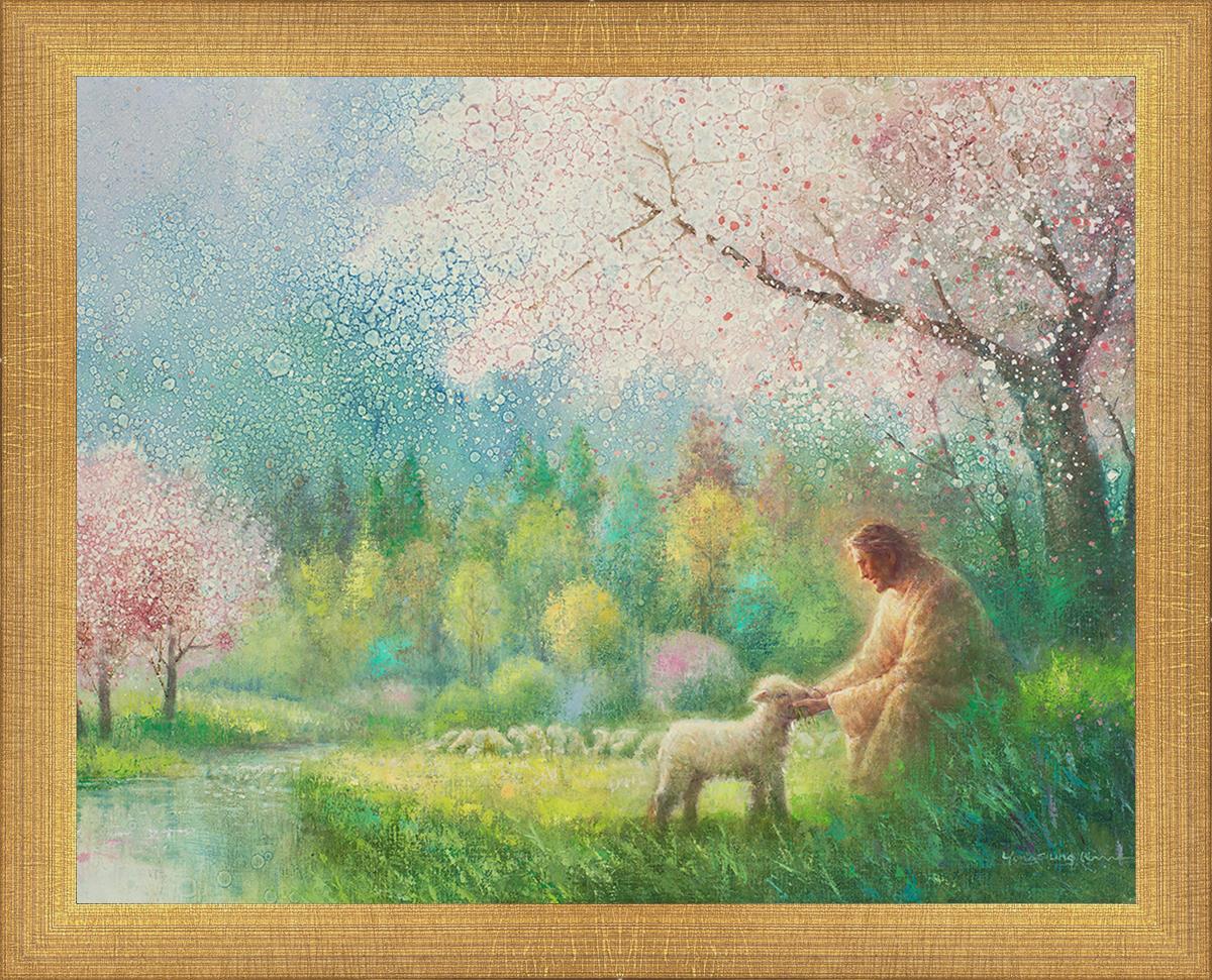 Continue Shopping"I Know Thy Name" by Yongsung Kim portrays Jesus Christ comforting a young lamb in a vibrant spring landscape, symbolizing His caring and personal knowledge of each individual.