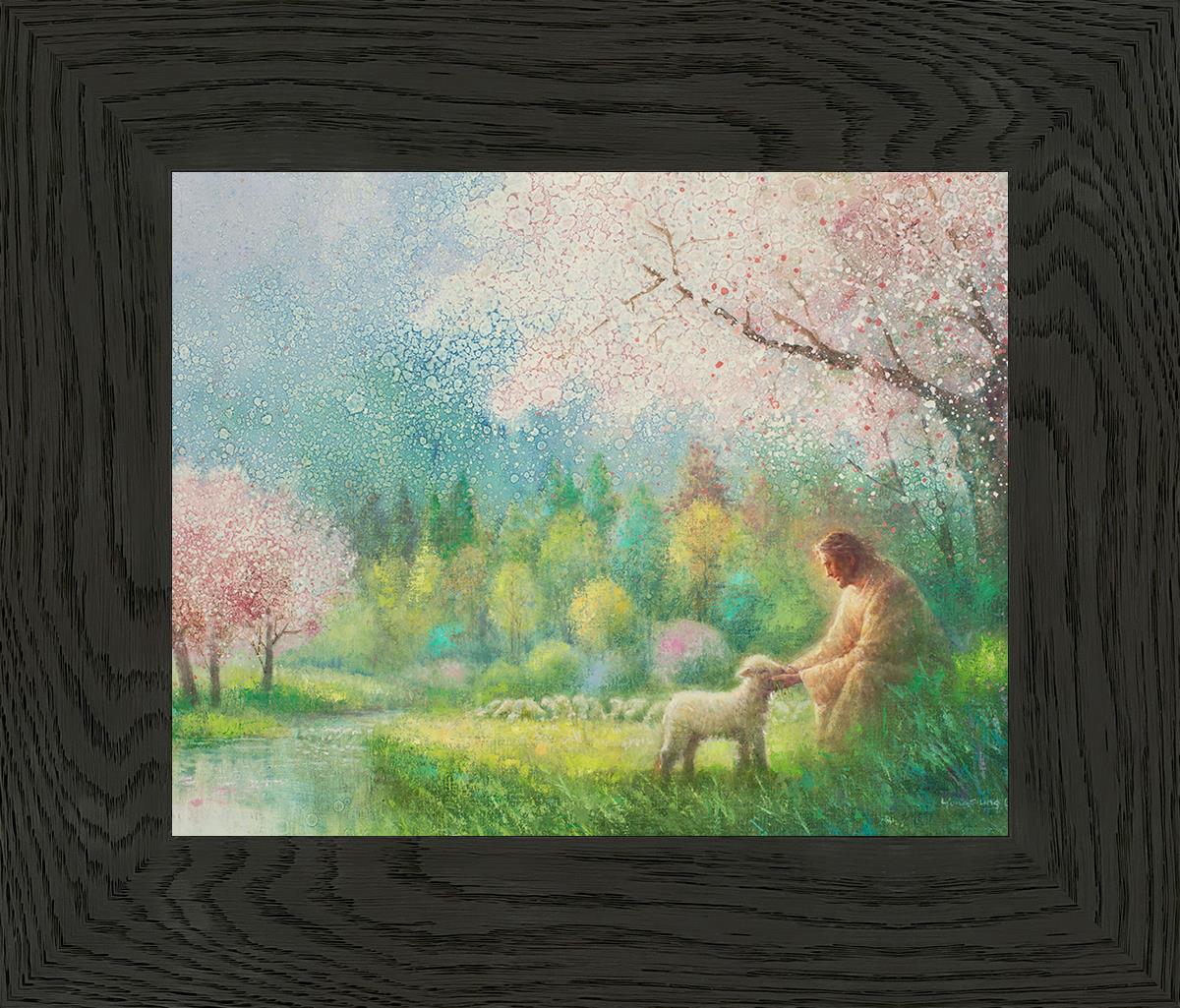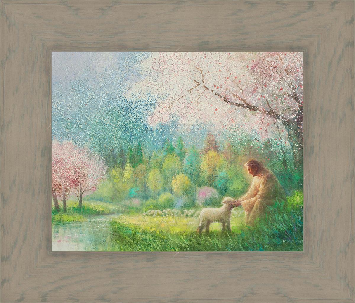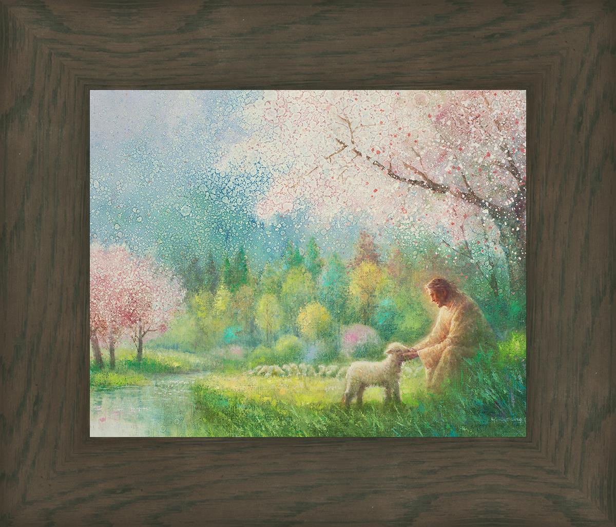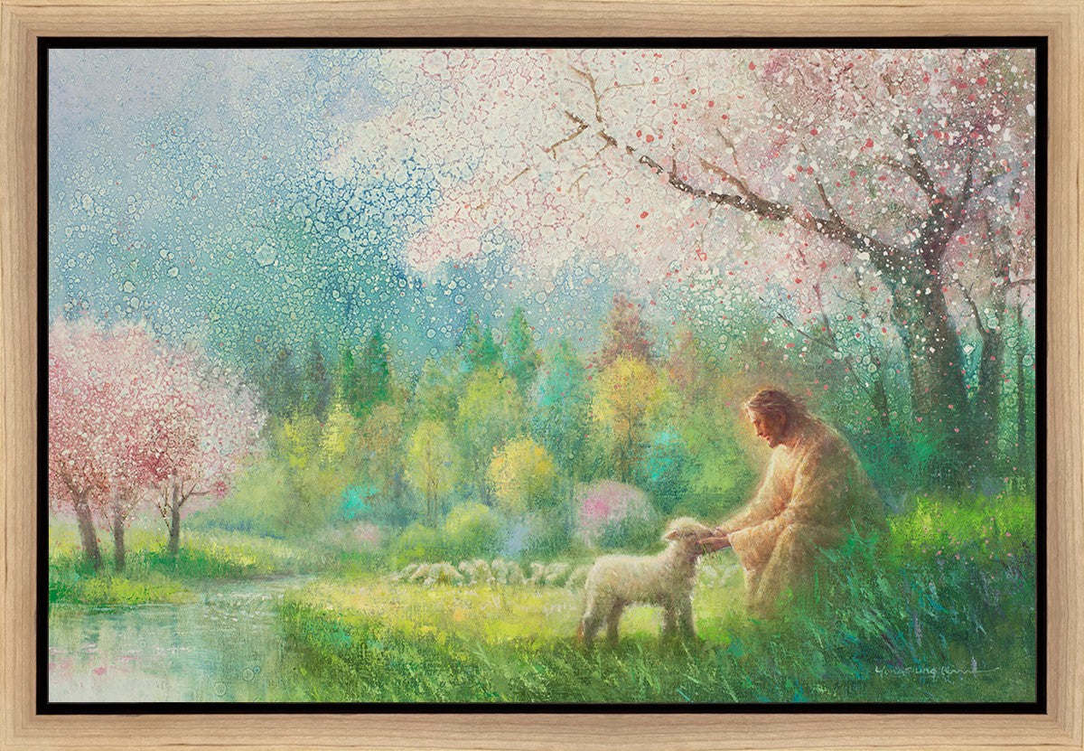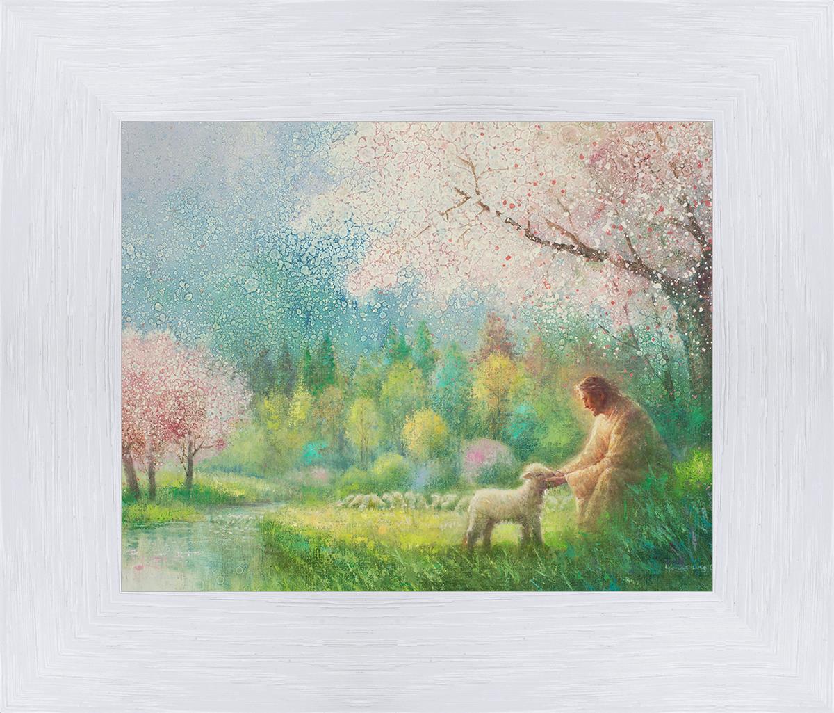 Continue Shopping"I Know Thy Name" by Yongsung Kim portrays Jesus Christ comforting a young lamb in a vibrant spring landscape, symbolizing His caring and personal knowledge of each individual.