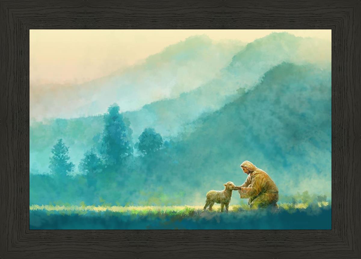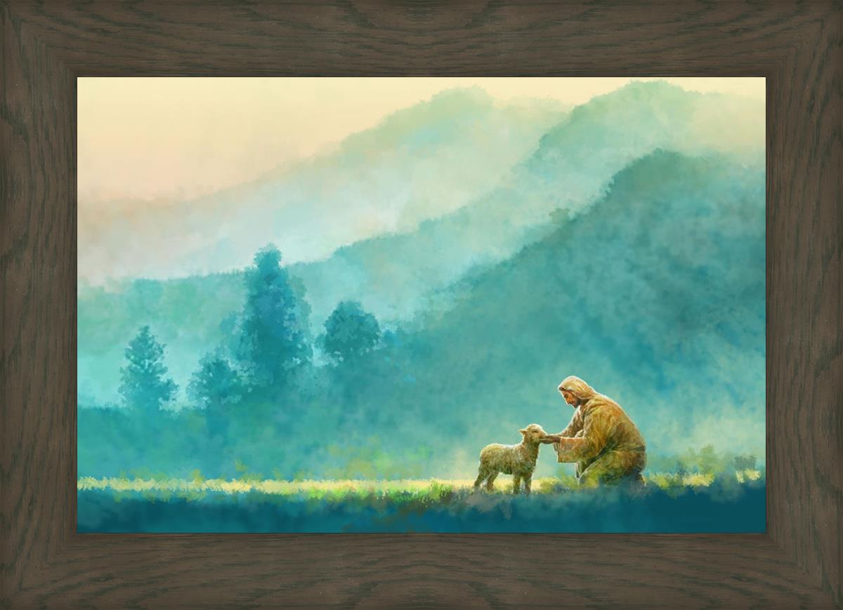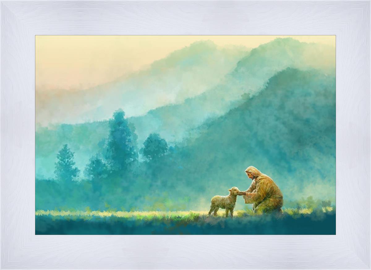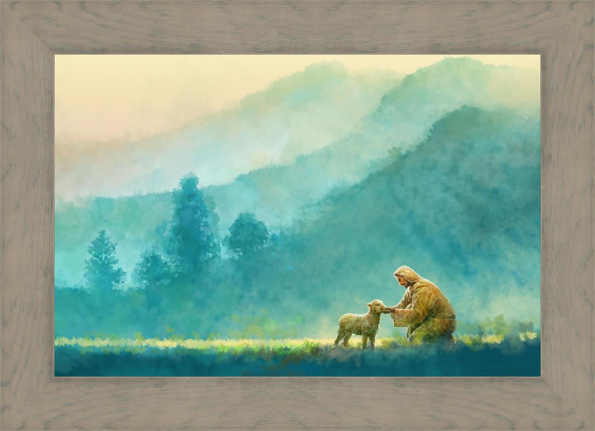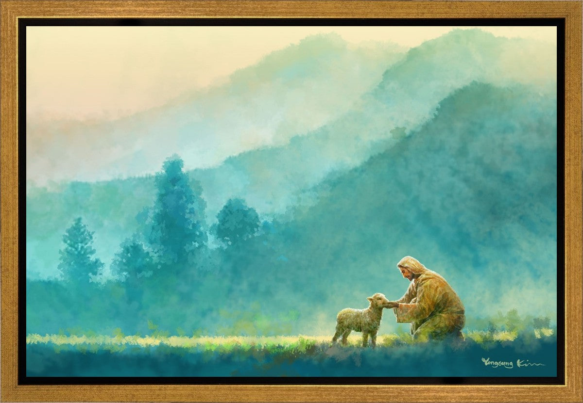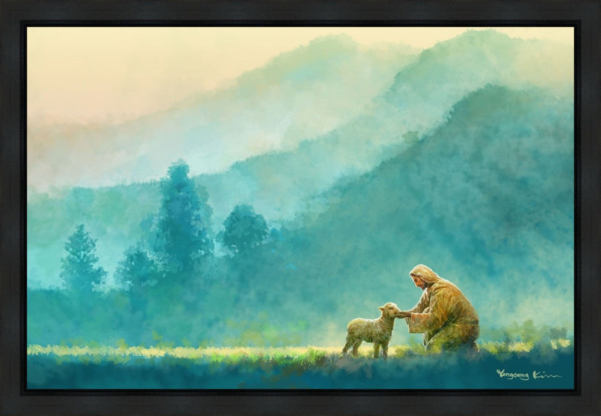 Continue Shopping"Little One" by Yongsung Kim is a painting showcasing Jesus Christ tenderly caring for a lost lamb in a vast field, symbolizing His role as the Good Shepherd. This captivating artwork by Yongsung Kim captures the essence of divine care and compassion, for each and every member of His flock.