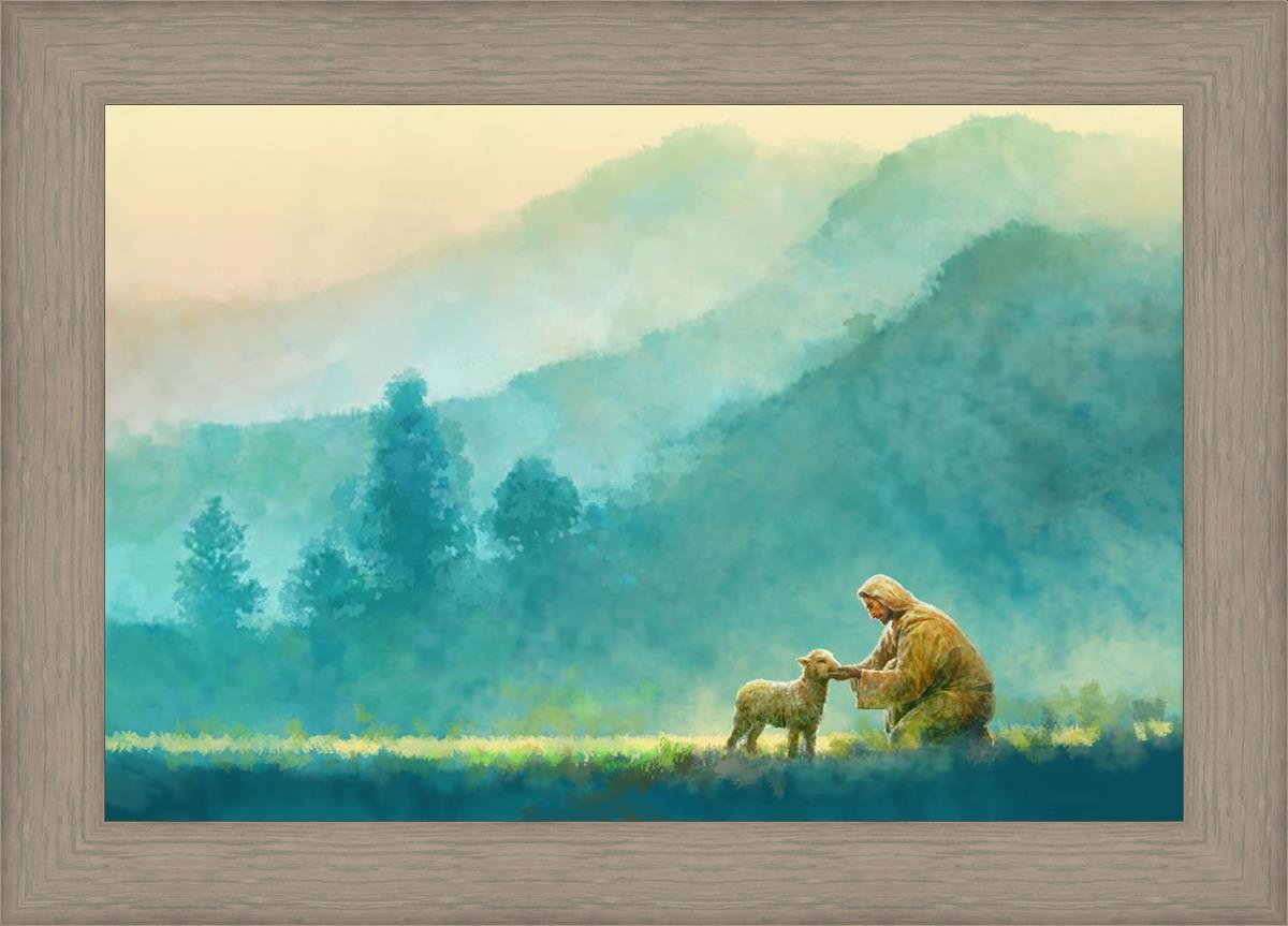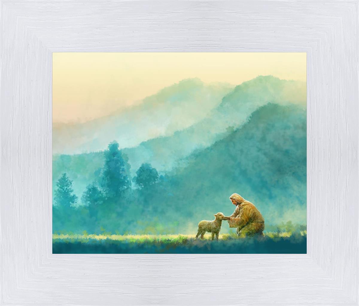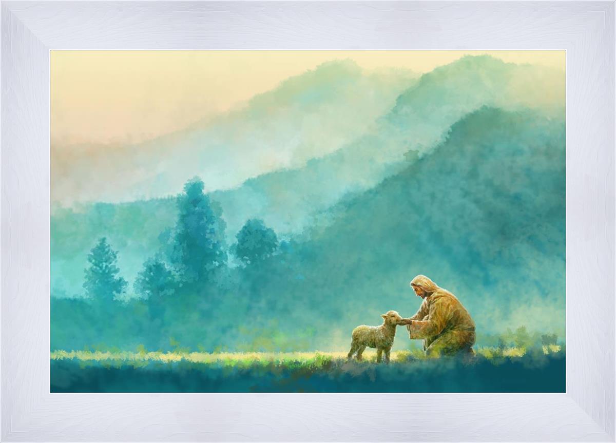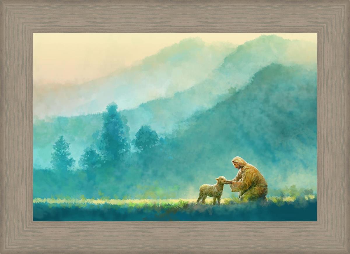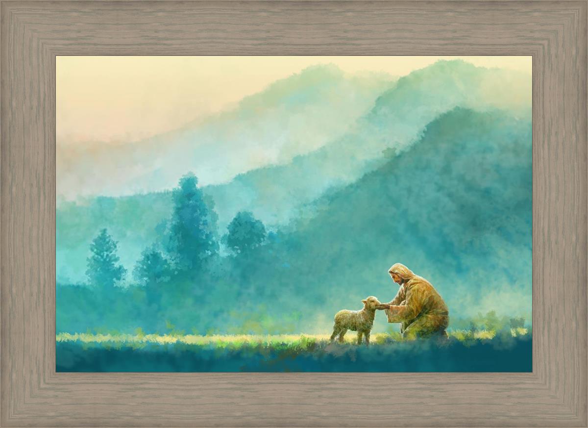 Continue Shopping"Little One" by Yongsung Kim is a painting showcasing Jesus Christ tenderly caring for a lost lamb in a vast field, symbolizing His role as the Good Shepherd. This captivating artwork by Yongsung Kim captures the essence of divine care and compassion, for each and every member of His flock.