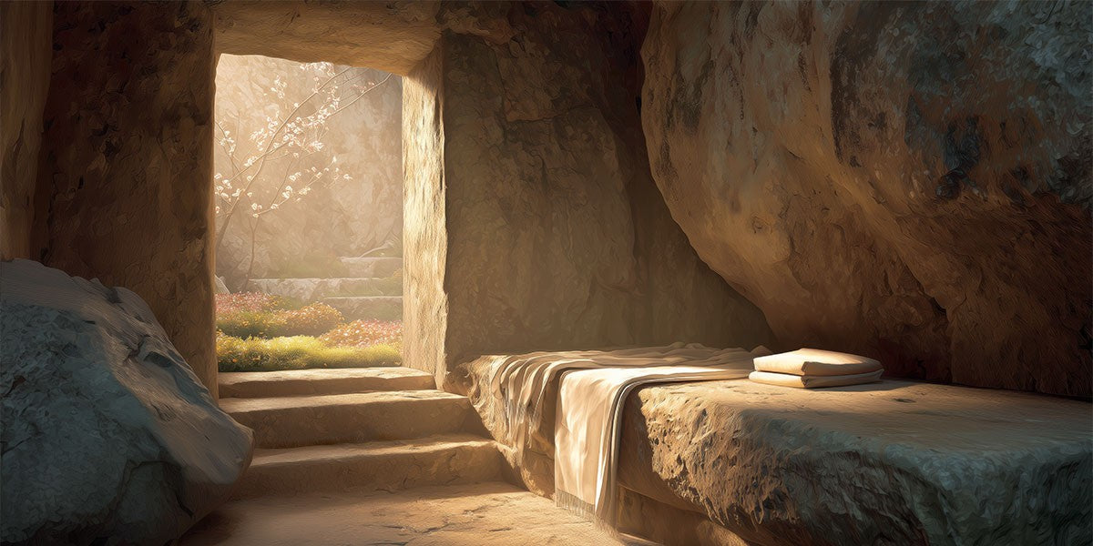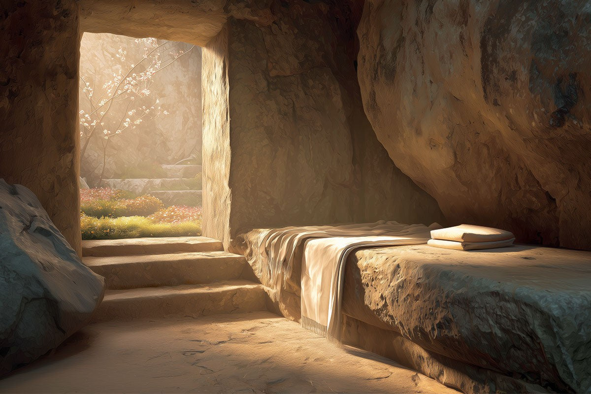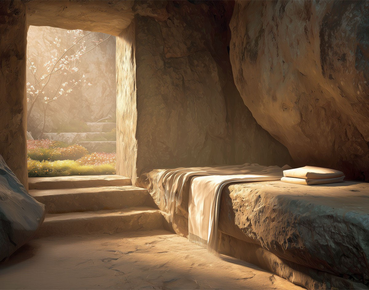 The empty tomb on Easter morning, with linens and folded cloth.
